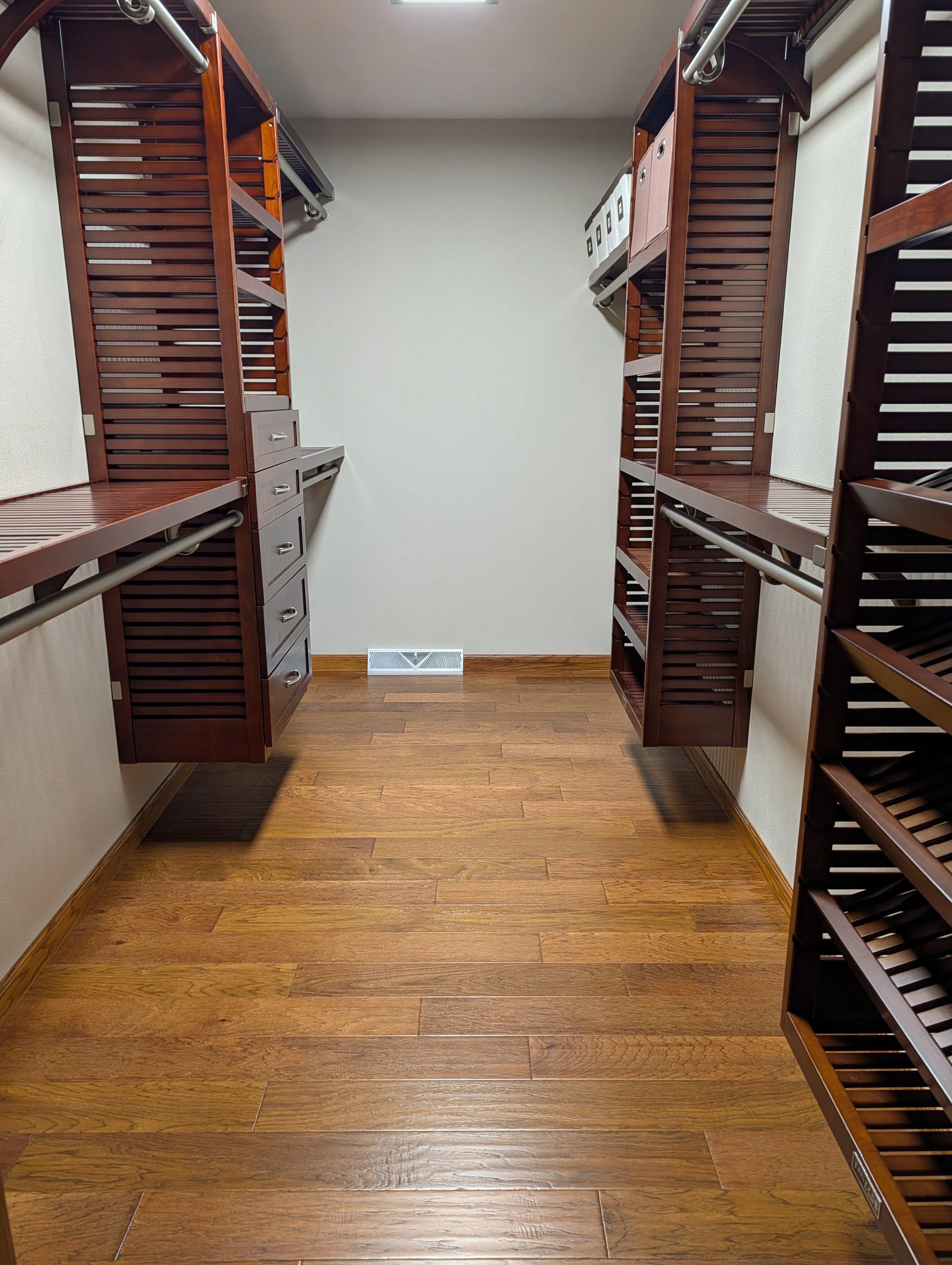 We needed to remove our current closet system to replace our flooring. Once removed, we realized we did not want to reinstall the existing closet system. I did my research and chose John Louis Home. We opted for chestnut color. The only negative thing I can say is that the wood is soft and dents easily. Be careful when installing. We are very happy with our remodeled closet! The only item left is to hang our floor length mirror on the end wall.